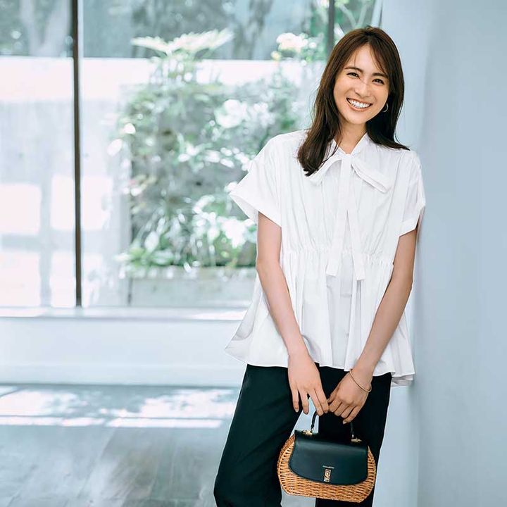 [白]ブラウス¥14,300(アレグレ)パンツ¥31,900(ブランベール/ウールン商会)バッグ¥25,300(ヴィオラドーロ/ピーチ)ピアス¥58,300〈モニス〉バングル¥6,330〈エイチアッシュ〉(ともにフォーティーンショールーム)/[サックス]ブラウス¥14,300(アレグレ)パンツ¥46,200(ATON/エイトン青山)イヤリング¥12,600(アビステ)バッグ¥14,850(ダイアナ/ダイアナ銀座本店)