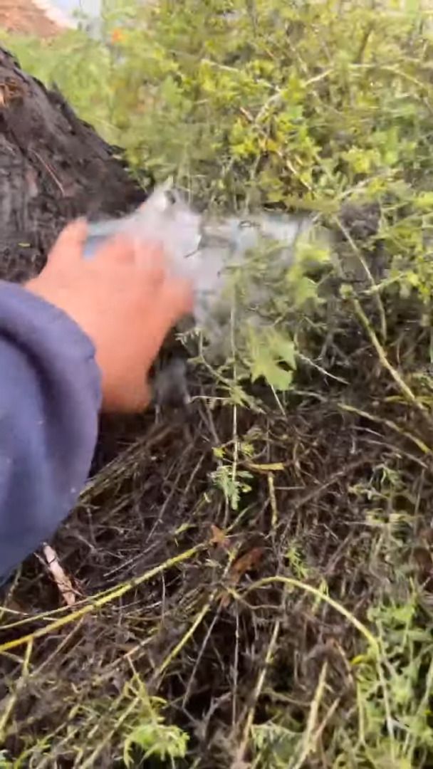 水の音を辿って1本の街路樹のそばにやって来た撮影者さん。 そこで、足元の茂みを手でかき分けてみることに。