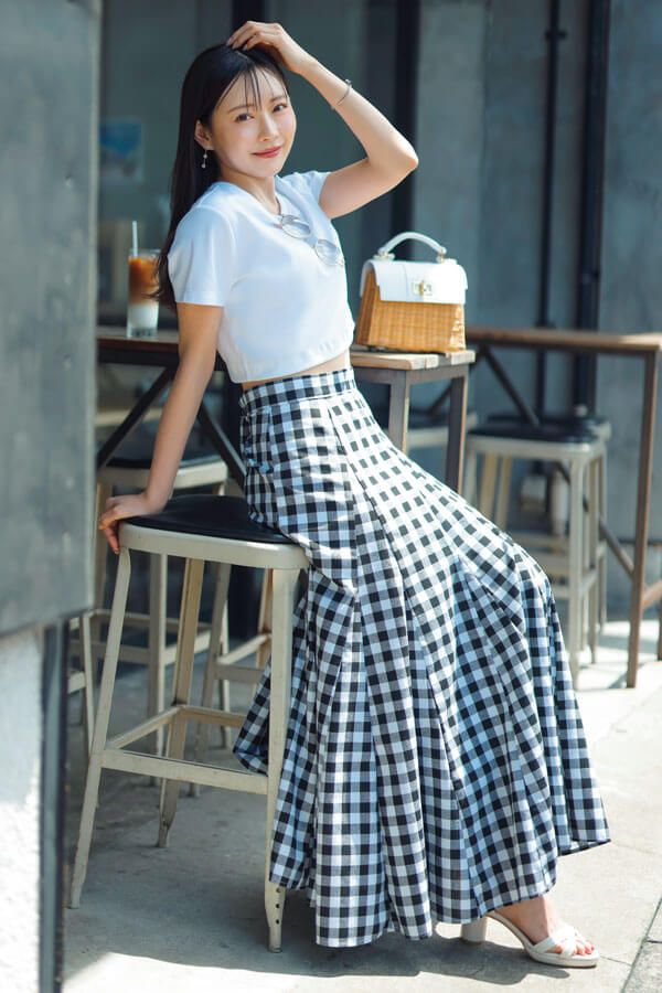 Tシャツ¥990/GU スカート¥25,300/アルページュ ストーリー バッグ¥26,950/ダイアナ(ダイアナ 銀座本店) サングラス¥8,000/OWNDAYS ピアス¥16,900/miyu nakamura、バングル ¥8,250、リング¥5,280/ともにネネンジュエリー(以上ロードス) シューズ¥23,100/モード エ ジャコモ(オギツ)