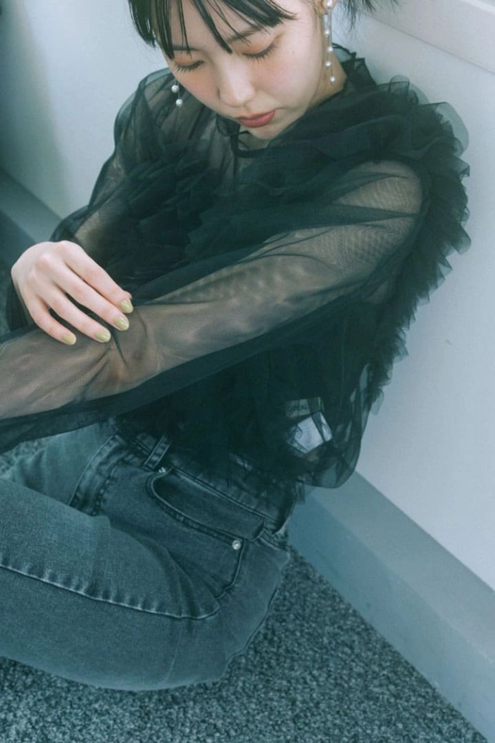 フリルトップスも透け感と黒で、はいモテコーデ♡ ヘルシーなお腹見せで視線を集めて。