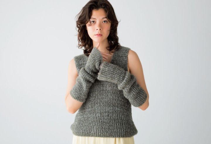 ラメ糸を織り交ぜた、柔らかな肌触りのローゲージニット。お揃いのアームウォーマーと合わせれば、上品な程よい肌見せが叶う。ニットジレ¥27,500 アームウォーマー¥15,400(共にテラ/ティースクエア プレスルーム TEL:03・5770・7068)