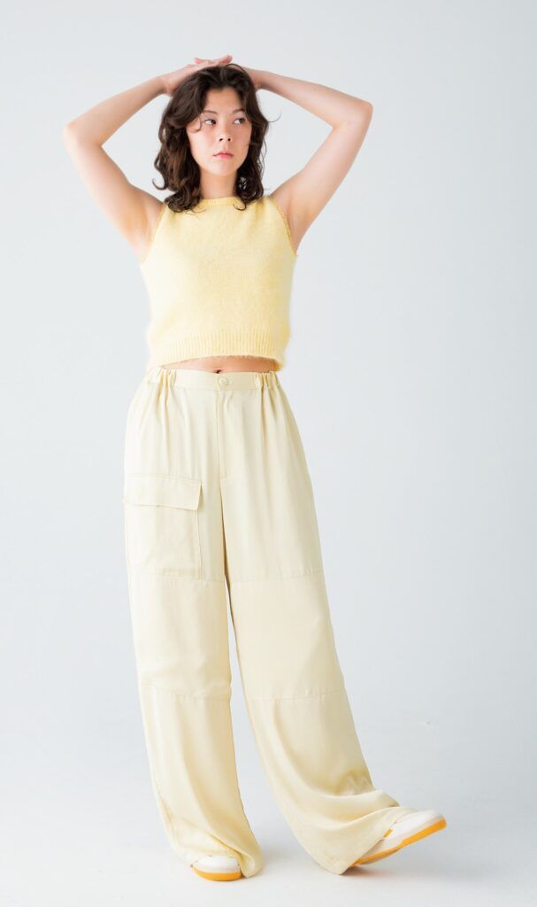 イタリア・トリノ発のブランドによる、コンパクトなシルエットのニットジレ。柔らかなアンゴラニットの風合いと、たまごのような優しいイエローがベストマッチ。袖口にはさりげなくレースがあしらわれ、シンプルななかに優美なムードも感じさせる。淡いトーンで揃え、軽やかな着こなしを楽しみたい。ニットジレ¥50,600(クリスティーナ ティ/PR01.TOKYO TEL:03・5774・1408) パンツ¥17,930(ネイヴ/オンワード樫山 TEL:03・5476・5811) スニーカー¥39,600(サエ/S&T TEL:03・4530・3241)