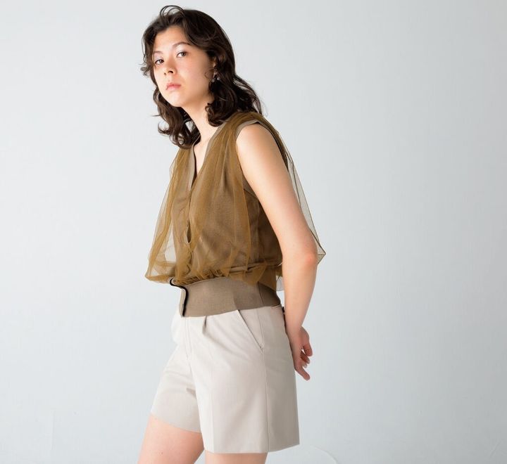 チュールをニットに重ねて華やかに。ニットジレ¥30,800(エストネーション TEL:0120・503・971) ショートパンツ¥59,400(タケマル https://www.instagram.com/takemaru_official/) イヤカフ¥26,400(ウジョー/エム TEL:03・6721・0406)