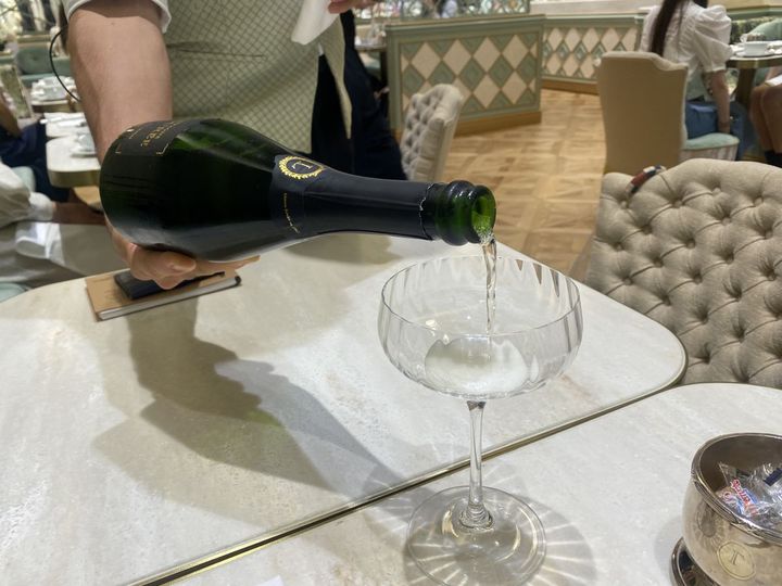 最初に運ばれてきたのは、「スペシャルアフタヌーンティー“HIBIYA”」に1650円で追加注文できる「シャンパーニュラデュレ」。こちらは「ラデュレ」オリジナルのシャンパーニュで、「ラデュレ」のサロン・ド・テでしか味わえないものです。