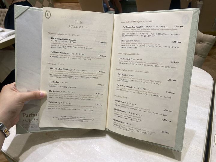 席に案内されたら、まずはセットのドリンクから注文します。約20種類の紅茶と、約10種類のコーヒーのなかから1種類選ぶことができます。メニューにはそれぞれ味の特徴や風味が書かれているので、そこから好みにあったものを選ぶのがおすすめ。迷ってしまったときは、スタッフに聞くこともできますよ。