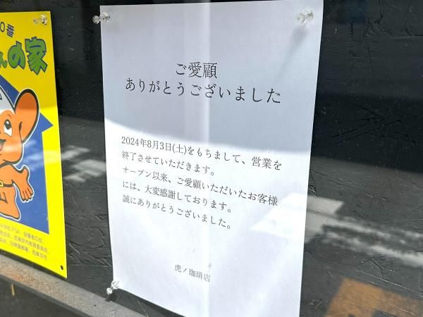 3. 【閉店】柳沢の「虎ノ珈琲店」急きょ8/3で閉店