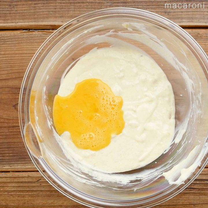 2: 卵を3回にわけて加え、その都度よく混ぜ合わせます。
