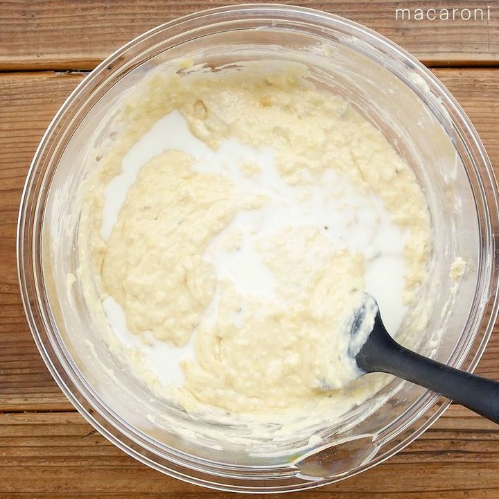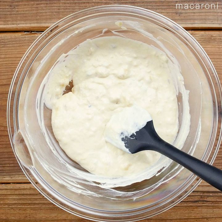 バナナ、クリームチーズ、バターを電子レンジで加熱する際、しっかりと柔らかくすることで、なめらかに混ぜ合わせることができます。バナナが硬い場合はマッシャーなどで潰してから混ぜ合わせてください。