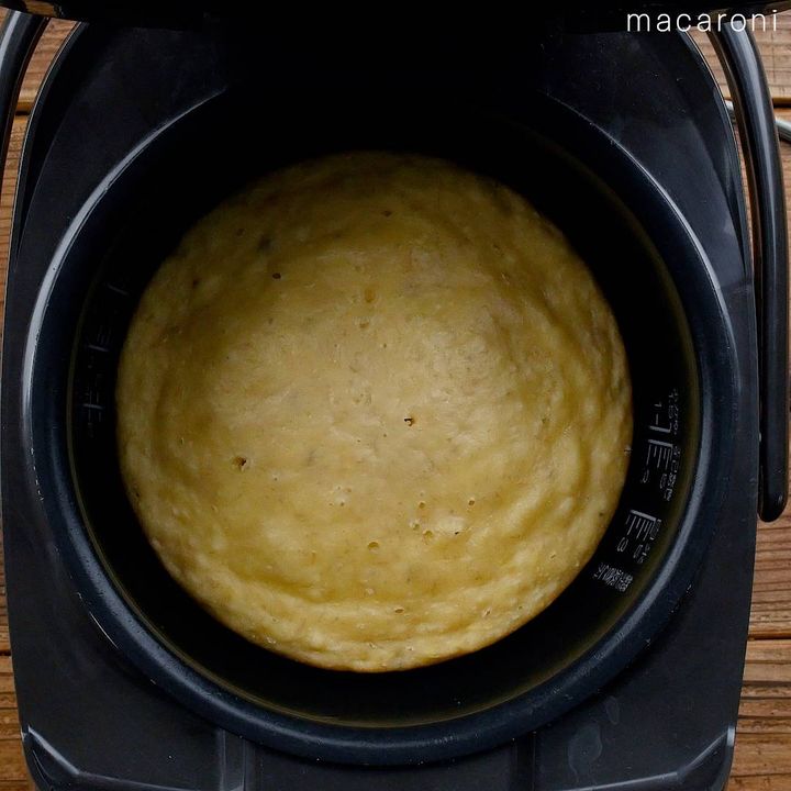 4: ④を炊飯釜に入れて2〜3回軽く落として空気を抜いたら、ケーキモードで炊飯します。※竹串を中央に刺して、生地がついていたら、さらに5分ほど追加して加熱してください。
