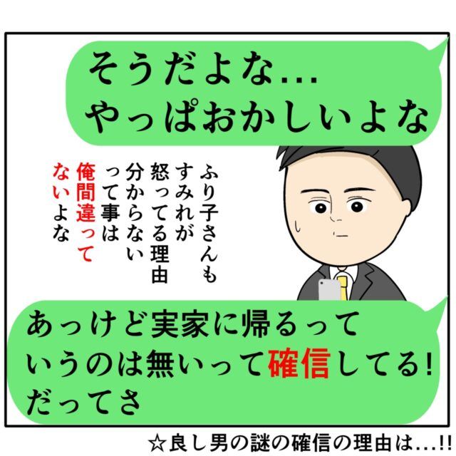 ふり子さんとのやり取りで、すみれさんが怒っている理由はやはり不明だと思わされた良し男さんは、自分のしたことは間違っていないと自信を持ってしまいました。そして更に、すみれさんは実家に帰ることは無いとなぜか確信していました。