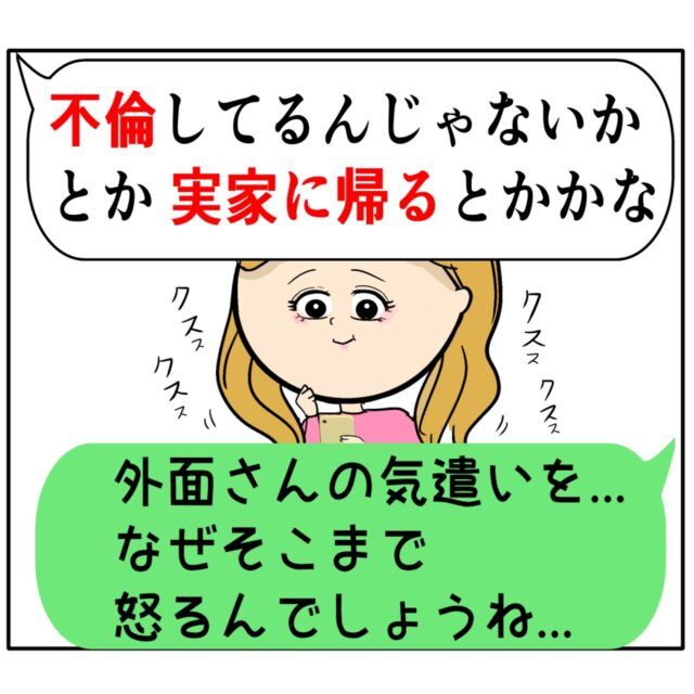 『不倫してるんじゃないかとか実家に帰るとかかな』と正直に答える良し男さんに『外面さんの気遣いをなぜそこまで怒るんでしょうね』と同調する返信をしながら、ふり子さんはたまらずクスクスと笑っているのでした。