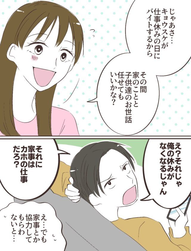 そして「じゃあさ・・キョウスケが仕事休みの日にバイトするから、その間家のことと子ども達のお世話任せてもいいかな?」と夫に聞いてみたところ「え?それじゃ俺の休みがなくなるじゃん。それに家事はカホの仕事だろ?」バイトの事は即否定された上に「家事はカホの仕事」と決めつけられ「え・・でも家事とか協力してもらわないと・・」と反論しました。
