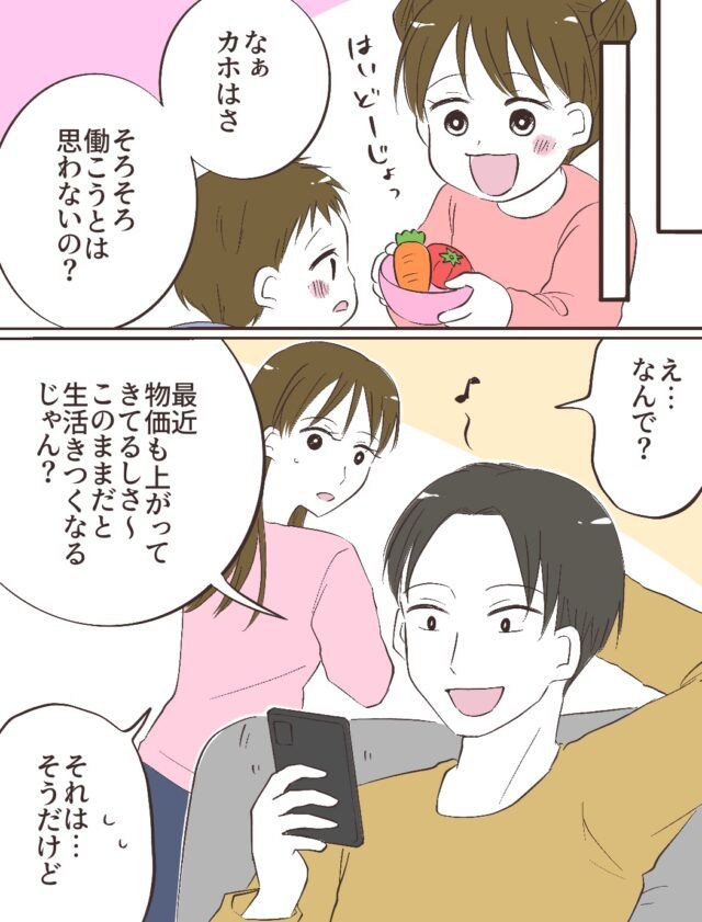 夕飯の支度をしていた時のこと、「なぁ、カホはさ、そろそろ働こうとは思わないの?」夫にそう言われ「え・・なんで」と聞き返すと「最近物価も上がってきてるしさ~。このままだと生活キツくなるじゃん?」スマホ片手に切羽詰まった様子もなくそう言い出した夫に「それはそうだけど・・」と答えました。