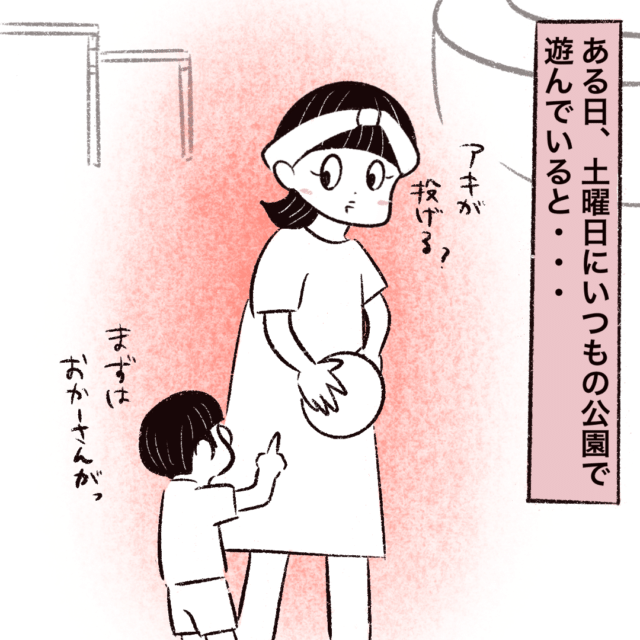 ある土曜日、いつもの公園でまるさんとアキくんがボールで遊んでいました。