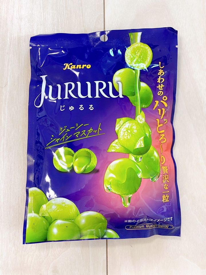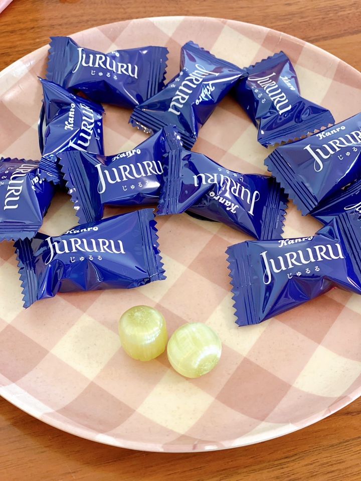 じゅるるは個包装タイプのキャンディで、美味しいシャインマスカット味の飴の中に同じくシャインマスカット味のとろっとした水飴のようなものが入っています。
