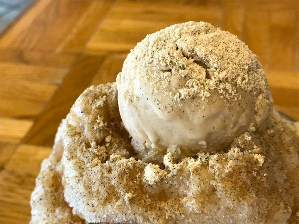 こんもり盛られた氷の上には自家製のほうじ茶シロップとほうじ茶アイスクリーム。そしてたっぷりの黒豆きな粉!