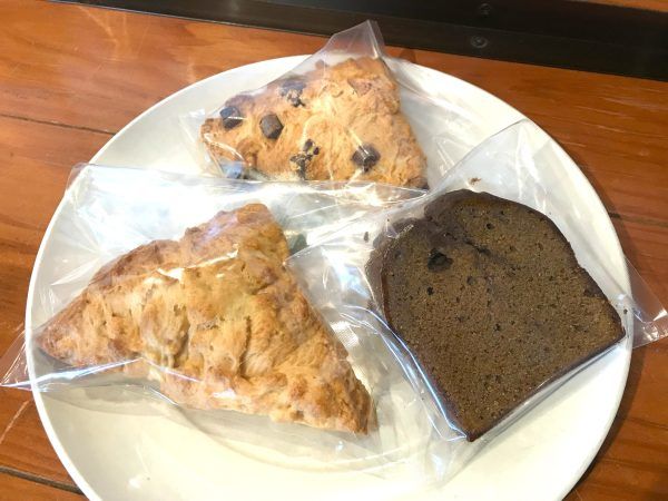 スコーン385円(左)チョコスコーン418円(上)紅茶スパイスパウンドケーキ378円(右)
