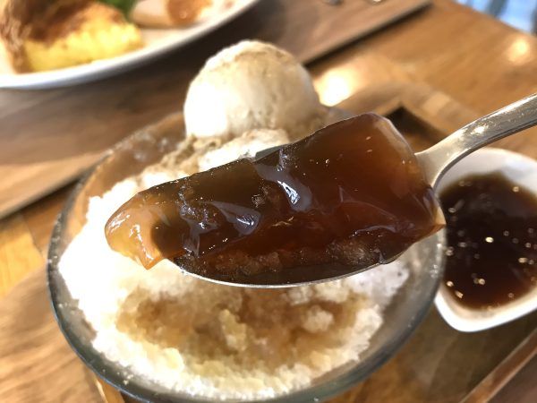 ふわっと削られた氷にしみ込んだほうじ茶シロップがとてもおいしい!やさしい甘さがじわわわ~っと口いっぱいに染み渡ります。トップのほうじ茶アイスはしっかい濃い味。食べ進めると中からプルップルなほうじ茶ゼリーが出てきます!
