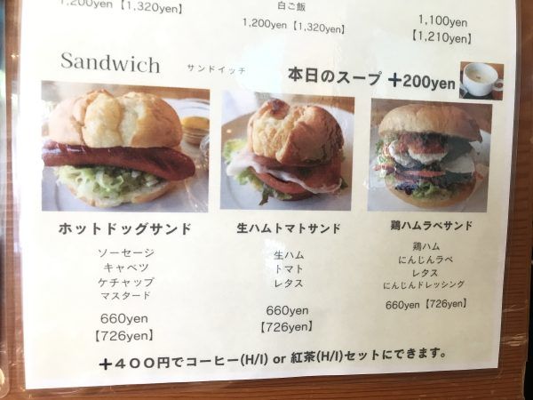 キッシュプレートの他にも、がっつり食べたいときには「豚バラのハニーマスタードプレート」、サクッとお手軽ランチにはサンドイッチもおすすめです。フードメニューはすべてテイクアウトできますよ。