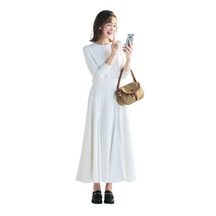 使いやすいクリアな白。歩くたびにドラマティックに揺れるフレアラインで、ワンツーコーデも華やかに。¥22,000(マイストラーダ)