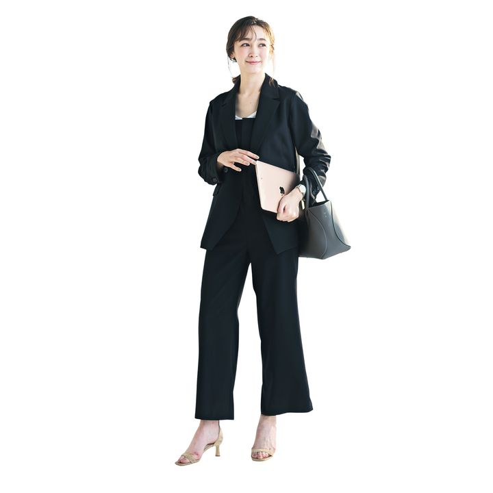 ハンサムな印象ではける黒を選択。ベルト付きデザインで、気になり始めたお腹もさりげなくカバー。¥21,890(ネイヴ/オンワード樫山)