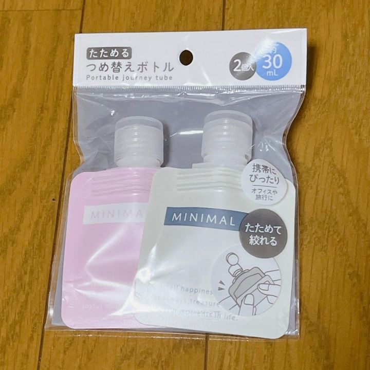 コンパクトに持ち運べるのがうれしい! シャンプー・リンスはこちら <たためる詰め替えボトル30ML2個入り(ダイソー、セリア、キャンドゥ)>