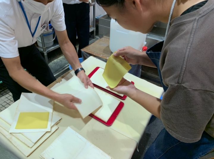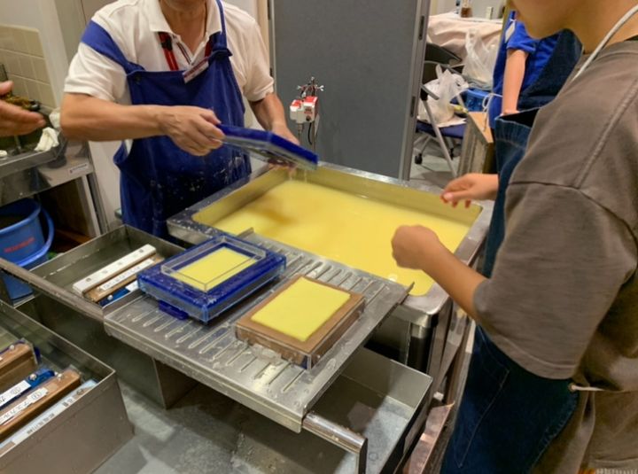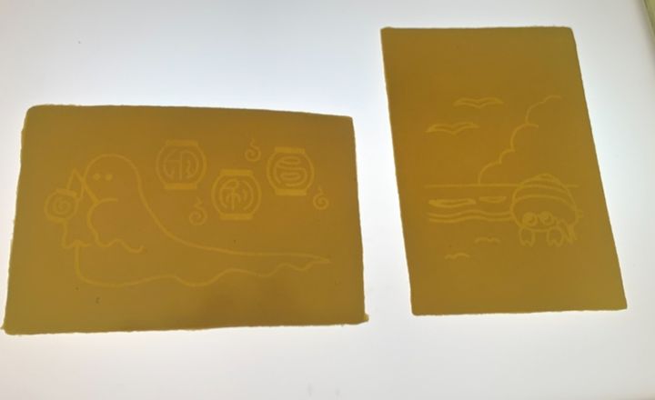 別の場所での紙漉き体験などで、ハガキ作りは何度か経験していますが、透かしの絵柄を入れられたのは今回が初めて(^-^)