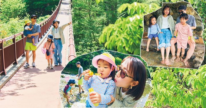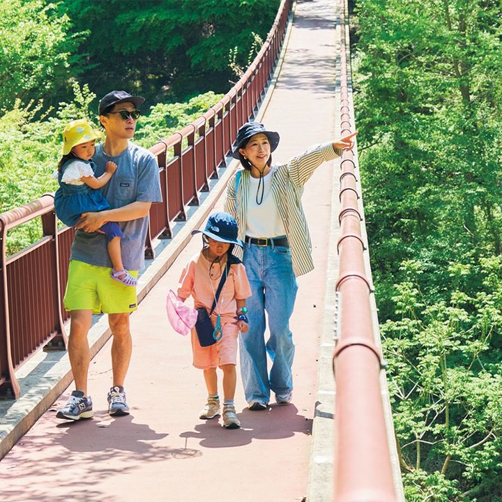 赤い橋を渡って公園内に。四季折々の川と山の景色が魅力です。子どものペースで45分ほどの軽いハイキングを楽しみつつ、自然の中をゆっくり散策するのがおすすめ。