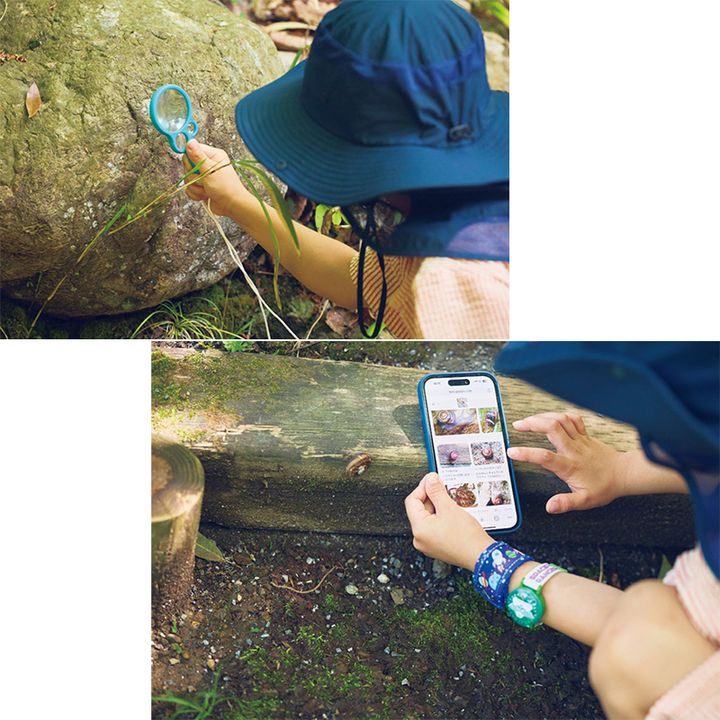 道中では初めて見る生き物や植物に出会うことも。虫の動きや体の模様を観察したり、触れるのを躊躇するような生き物に出会った時には、虫眼鏡が活躍。図鑑は重いのでGoogleレンズで代用。