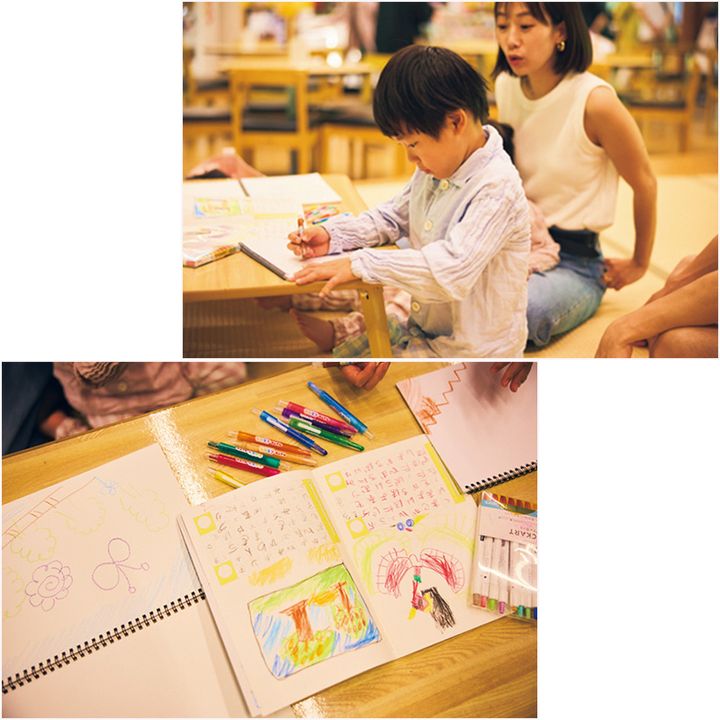 お風呂上がりは広々したテラスや湯上がりどころでまったり。アイスを食べたりお絵描きしたり気ままに過ごします。