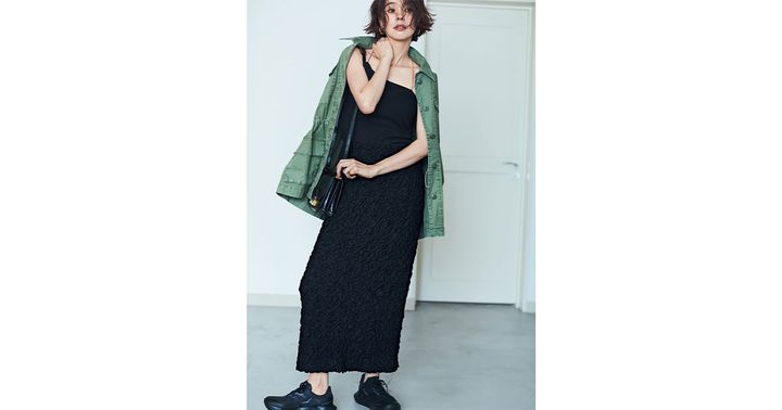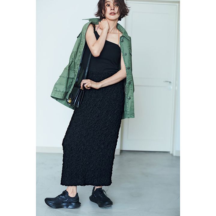 スカート¥15,400(ミラオーウェン/ミラオーウェンルミネ新宿2店)ジャケット¥24,200(アルページュストーリー/アルページュストーリープレスルーム)キャミソール¥6,930ピアス¥3,520(ともにアクテ)リング¥23,100(スキャット/ロードス)バッグ¥11,900(チャールズ&キース/チャールズ&キースジャパン)スニーカー¥31,900(ホカ®/デッカーズジャパン)