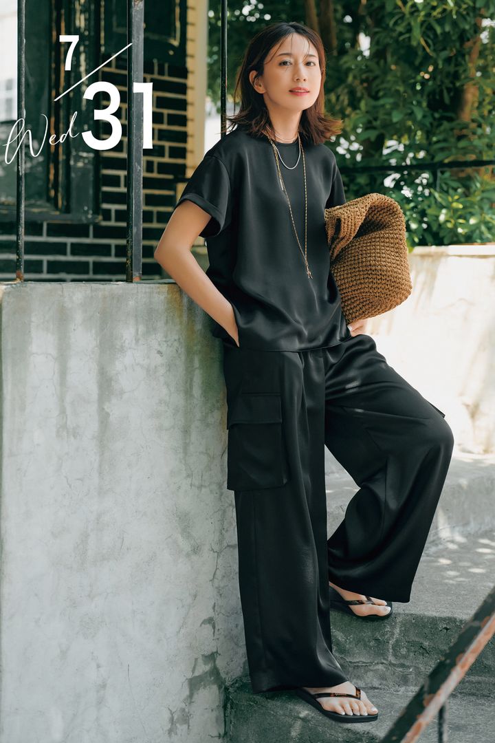 全身黒でも、サイズと素材で涼しげに!ゆるっとリラクシーなトップスとサテン素材カーゴパンツは、セットアップで旅行に連れていきたいアイテム。