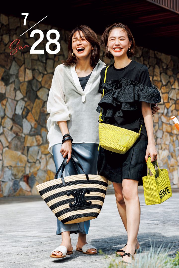 [浅見さん]Tシャツ¥14,300(マイストラーダ)パンツ¥13,500(バナナ・リパブリック)ピアス各¥242,000(YON)リング¥8,690(オジュール)ショルダーバッグ¥111,100、ハンドバッグ¥162,800(ロエベ)サンダル¥29,700(ツル バイ マリコ オイカワ)