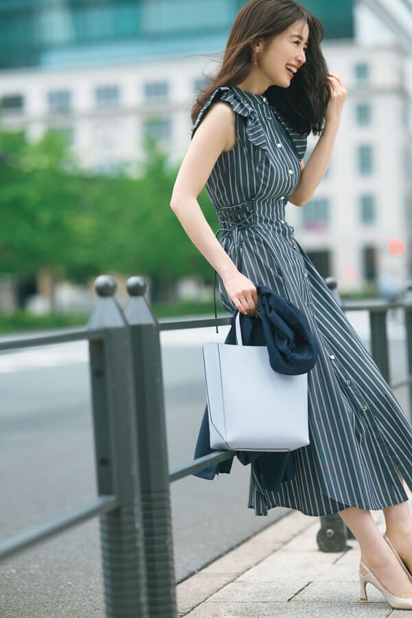 3. コンサバになりがちなストライプを女性らしく!フリル&リボンで可愛げをプラス