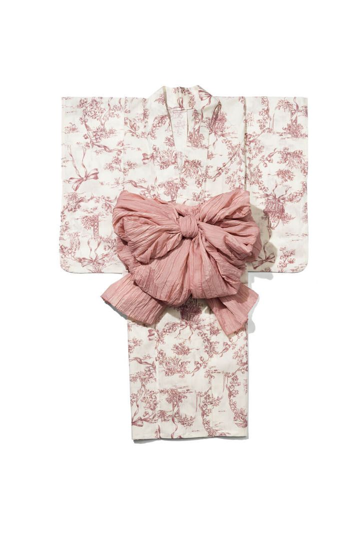 フランスで親しい人に贈られる〝ミュゲの花〟をメインモチーフに、お庭を連想させるアーチやかご、レディライクなリボンも描かれたロマンティックな世界観。セットのへこ帯でピンクの甘いワントーンに仕上げて。