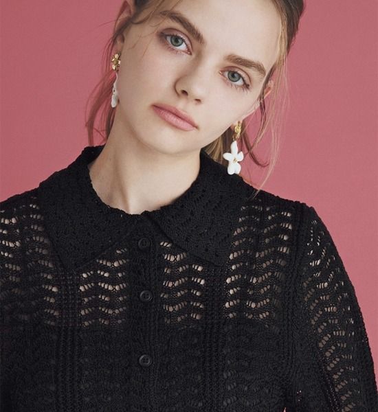 ピアス 13,200円/NACH(ROSE BUD ルミネエスト新宿店) ニット15,400円/TODAYFUL(Life’s 代官山店) 耳もとに1つだけで目にとまるデザイン。シンプルなトップス1枚、何となく物足りない…というときにも。フラワーピアスのなつかしい甘さにつられて、レース編みニットもレトロな表情に。