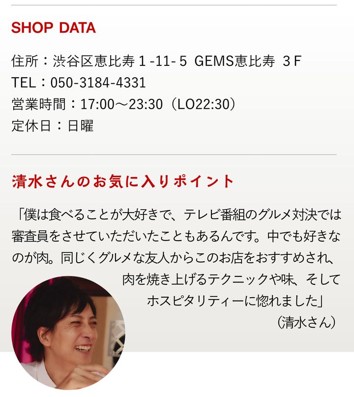 恵比寿駅東口から徒歩2~3分。人気飲食店ばかりが集う「GEMS恵比寿」の3階に鎮座する『カルネジーオ イースト』が、清水さんの行きつけの店だ。