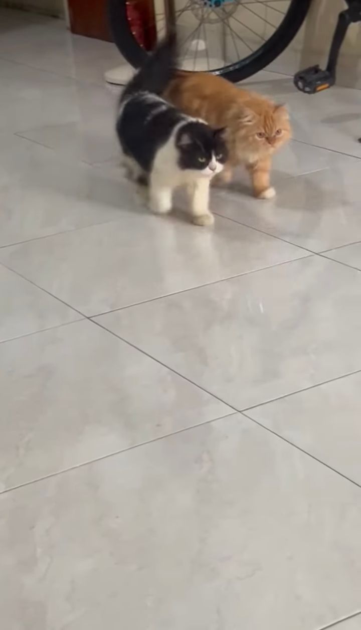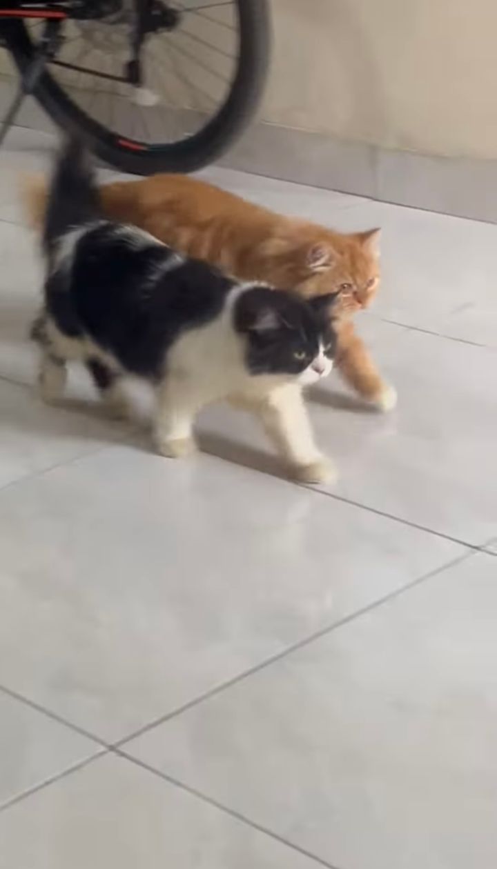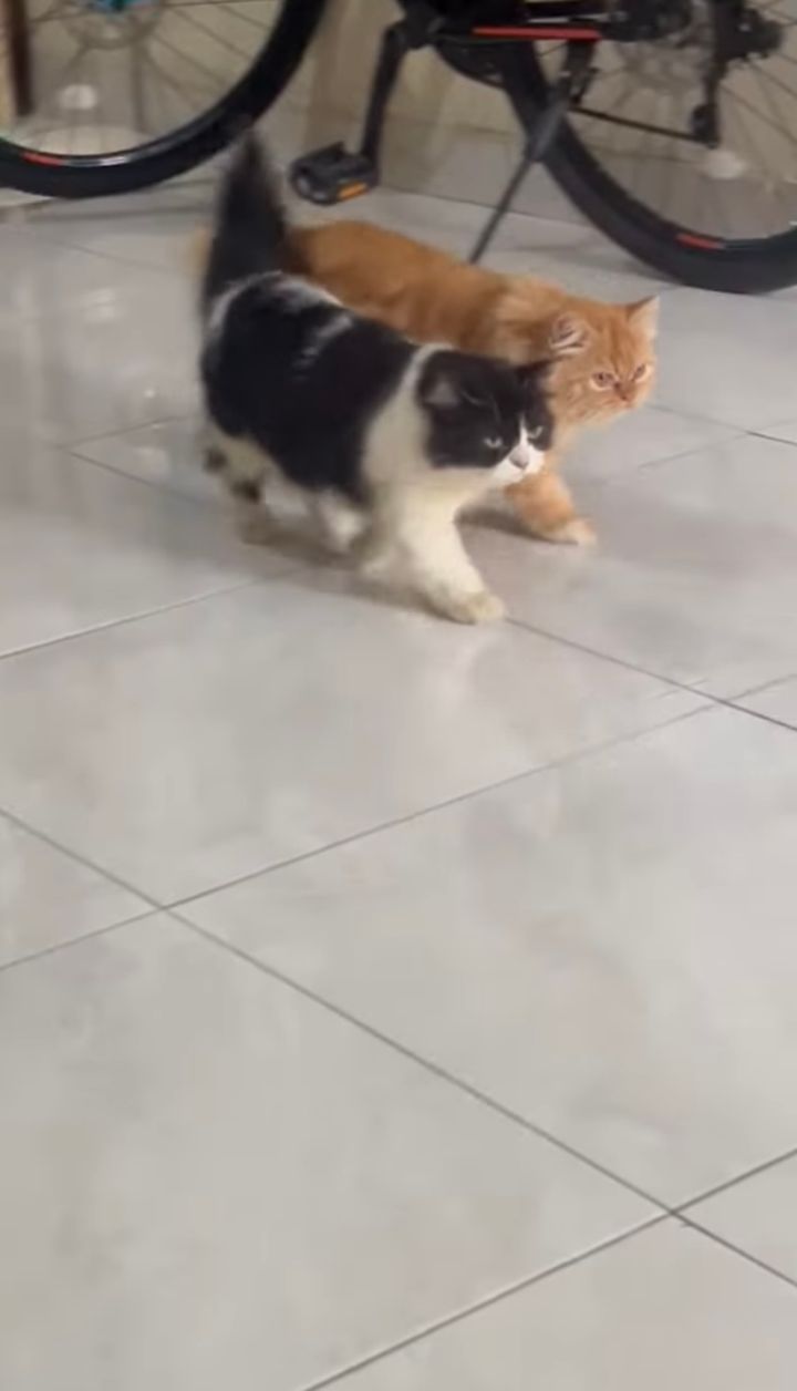 肩を並べて同じ方向に歩き出した2匹の猫。 その光景に飼い主さんは驚かされました。
