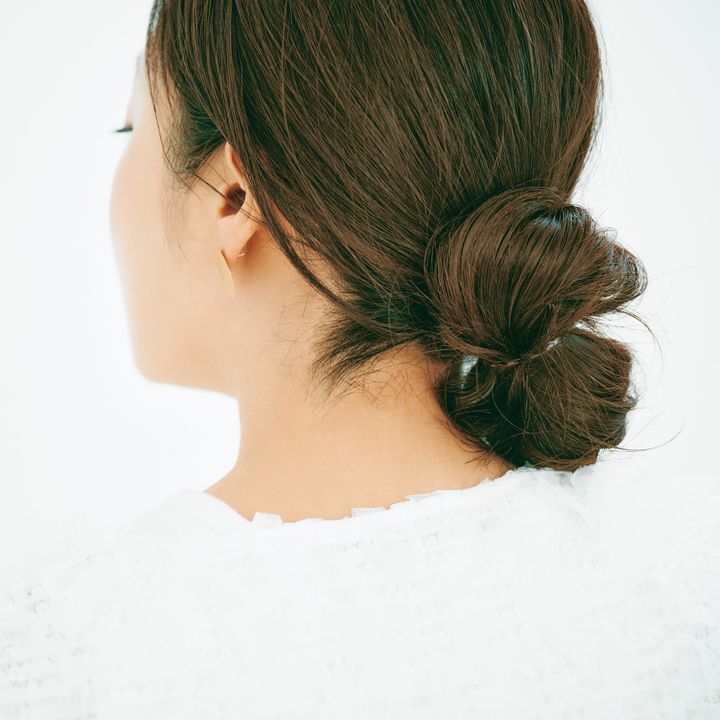 「フェミニンな服にはまとめ髪でバランスよくスマートに。雨にも風にも負けず、清潔感も出せます」。耳から下の髪を軽く巻く。首の窪みの位置で結んで毛先が上になるようにねじり、毛先を下にして別のゴムで結んで毛先をゴムに入れ込む。結んだ根元を引き出して後頭部に丸みをつける。