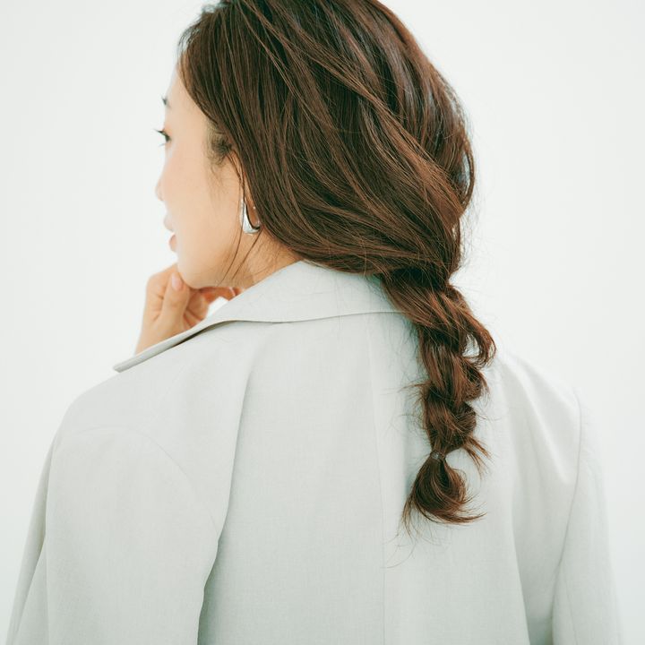「梅雨時期は巻いても落ちやすいのでアレンジを活用」。ベースをゆるく巻き、後ろでまとめて衿足から下の毛束を三つ編みにしてゴムで固定。結び終わりの毛先をゴムにしまい込み、毛先をほぐしてゆるさを。もみあげも引き出しニュアンスを。