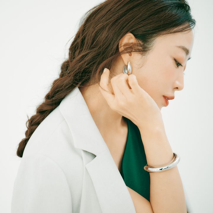 (シニヨン)トップス¥19,800(アルページュ ストーリー)ピアス¥49,500〈モニス〉バングル¥6,330〈エイチアッシュ〉(ともにフォーティーン ショールーム)