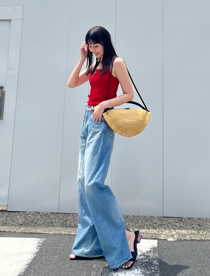 太陽に映える赤いキャミとデニム。かごバッグでフレンチシック満喫!【365日スナップ】白野あゆみさん