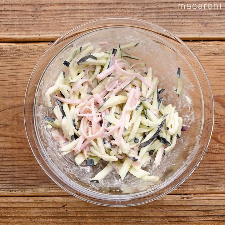 2: ボウルになす、ハム、片栗粉、薄力粉、水を加えて混ぜ合わせます。