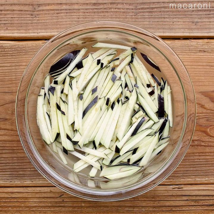 1: なすはヘタを落として細切りにします。水に5分ほどさらして水気を拭き取ります。