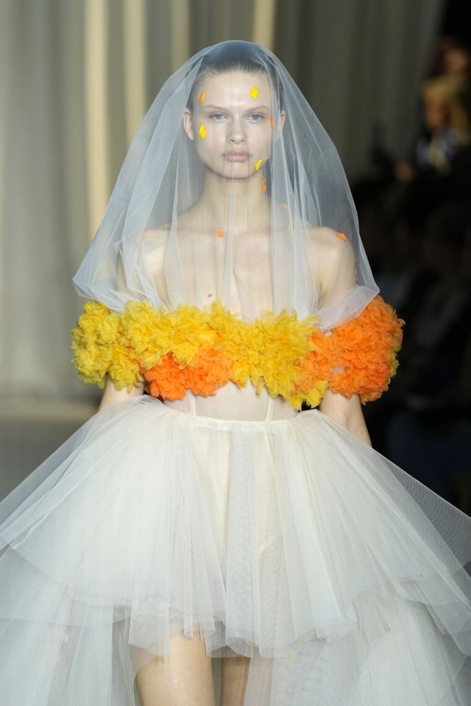 イエロー、オレンジのチアフルなカラーリングの花の装飾が全体のアクセントに。顔を覆うチュールのベールにも花びらがちりばめられ、可憐な花嫁姿を印象付けています。/ジャンバティスタ・ヴァリ