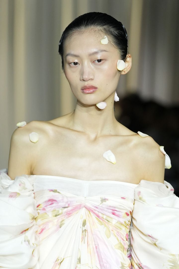 額から肩にかけて、流れるように花びらがあしらわれて。ほんのりピンク色の、濡れたようなツヤ感を出したメイクとともに、フレッシュなムードが漂っています。/ジャンバティスタ・ヴァリ
