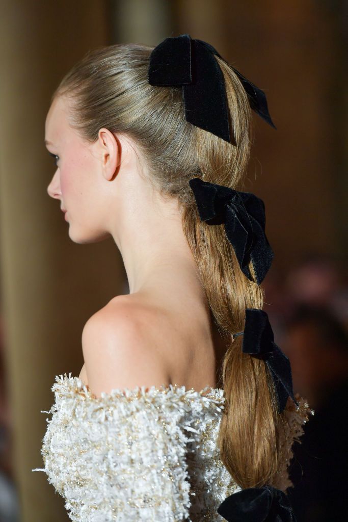 スリークなハイポニーに大ぶりなベルベットのリボンをあしらった大人ガーリーなスタイル。シックな黒&高級感のあるベルベット素材がエレガントさを高めるポイントです。/タマラ・ラルフ