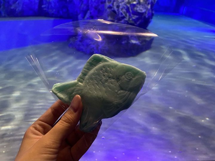 いつもはピンク色の定番商品が、COOLなカラーに変身した「もちもち!みずいろ冷やしきんぎょやき」500円。