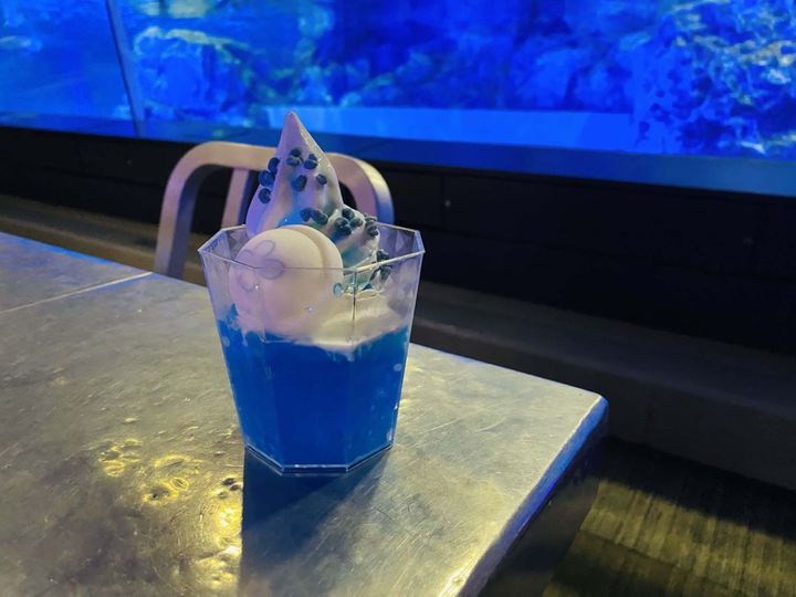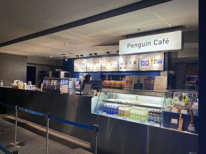 イベントでは、鮮やかな青が目を引く限定メニューも楽しめます。販売場所は、5階の「ペンギンカフェ」。ドリンクやフードを片手に館内を巡るのはもちろん、長テーブルや2人用テーブル、ソファ席もあるので、座ってゆっくり味わうこともできます。