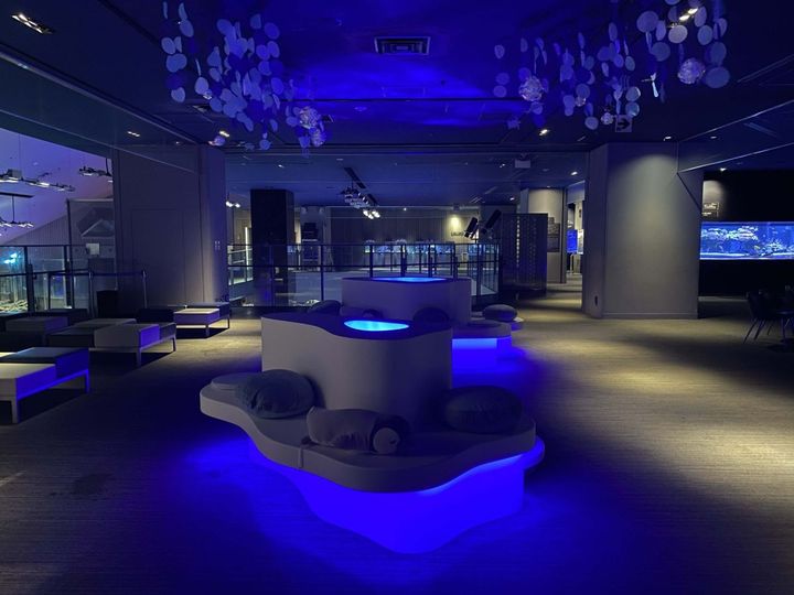 さらに6階大水槽前では、ブルーのライトで海の中を表現し、すみだ水族館にいるいきもののモチーフや冷感クッションが飾る「COOL海中ラウンジ」を実施! ひんやりとしたクッションに座って休憩できる、夏にぴったりの空間です。